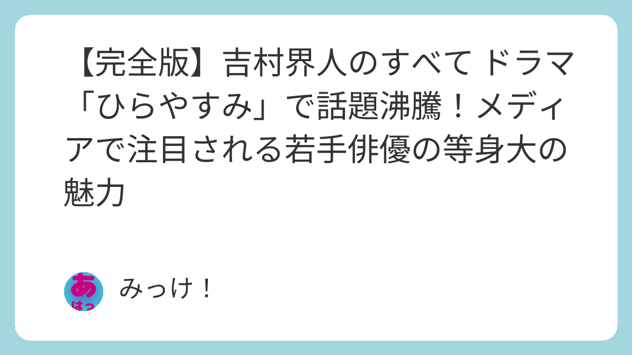 皆さんも、ぜひ「ひらやすみ」をご覧になって、吉村界人さんの等身大の魅力を感じてみてくださいね!
