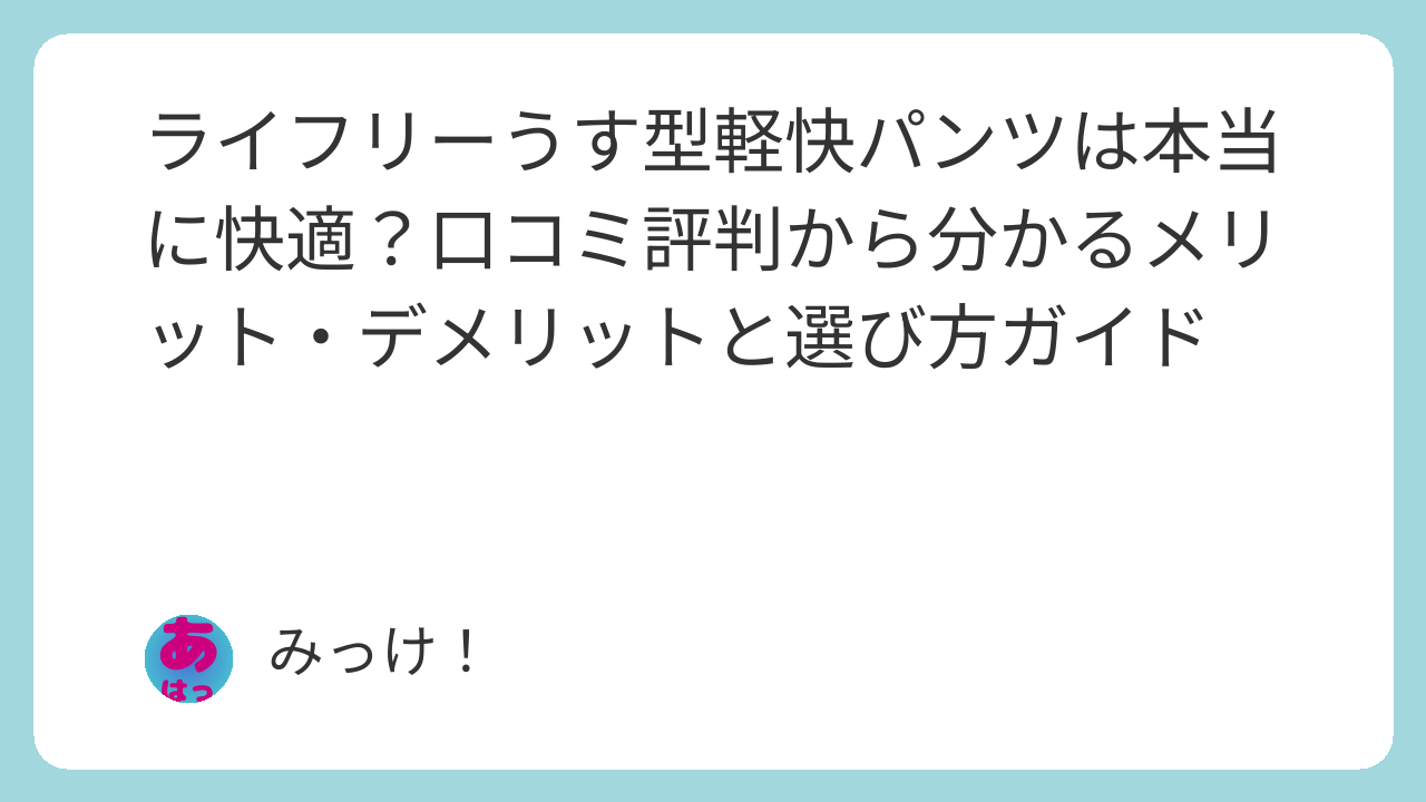 この記事では、実際の利用者の口コミや評判をもとに、ライフリーうす型軽快パンツの特徴やメリット・デメリット、選び方のポイントを詳しく解説します。下着のような快適なはき心地を実現する特許技術や、薄型なのにしっかり吸収する秘密も分かりやすく紹介していますので、購入を検討されている方はぜひ参考にしてください。